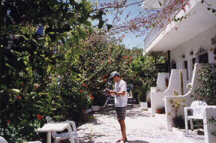 Une agréable promenade et nous arrivons à l'hôtel Poséidon à Paléochora. Merci le routard, le choix s'avérera très judicieux. Une chambre avec coin cuisine, une petite table pour manger dehors, une patronne adorable à qui nous faisons découvrir le nouveau routard (elle se précipite pour voir ce qui se dit de la concurrence) et une petite chatte noire et blanche déjà dans nos jambes.